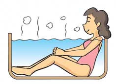 욕탕에 들어가 있을 때는 따뜻한 탕(40도-41도 정도)에서 편안하게 들어가 있는 것이 포인트입니다. 뜨거운 물에서는 오랫동안 몸을 담그고 있을 수 없고, 미지근한 물은 피부의 표면만을 데우므로, 몸의 중심까지 데울 수가 없기 때문입니다. 또 뜨거운 물은 심신을 긴장시키므로 오히려 통증을 일으키는 경우도 있습니다. 느긋하게 천천히 탕 속에 들어가 있을 수 있는 온도가 좋습니다.